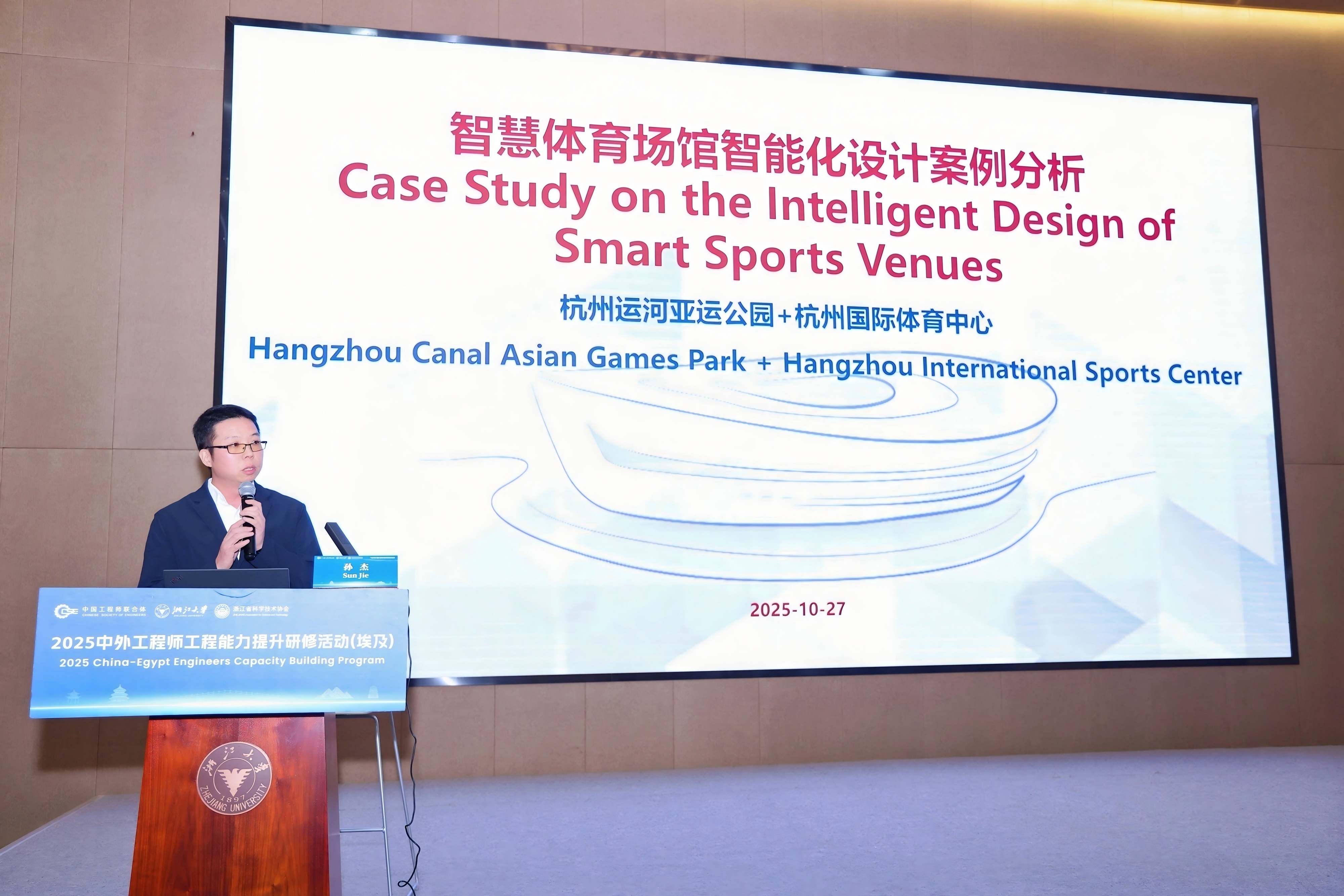 10月27日,研修活动迎来收官之日。当天上午,中埃工程师先实地考察杭州运河亚运公园智慧体育场馆,近距离感受绿色智能建筑在大型体育场景中的应用;随后,一行人移步浙江大学工程师学院,参与智慧场馆建设专题工作坊,围绕场馆智能化运营、绿色节能技术优化等议题展开最后一轮深入研讨。研讨结束后,结业仪式正式举行。8 天的朝夕相处,让中埃工程师从陌生到熟悉,在技术交流中相互启迪,在思想碰撞中达成合作共识。巴西姆・埃尔赛义德(中国建筑集团埃及分公司机械副经理)在仪式上感慨:“本次研修活动虽已落幕,但两国工程师相互学习、共同进步的征程,已站在全新的起点,即将开启新的篇章。”